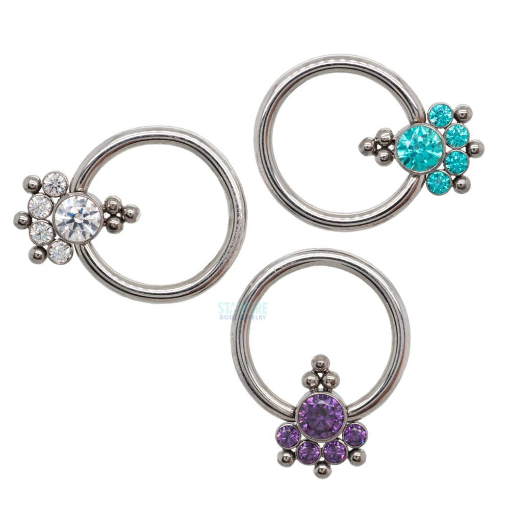 An amazing piece for people who want lots of sparkle on their ring. The captive bead cluster has five total brilliant gems!