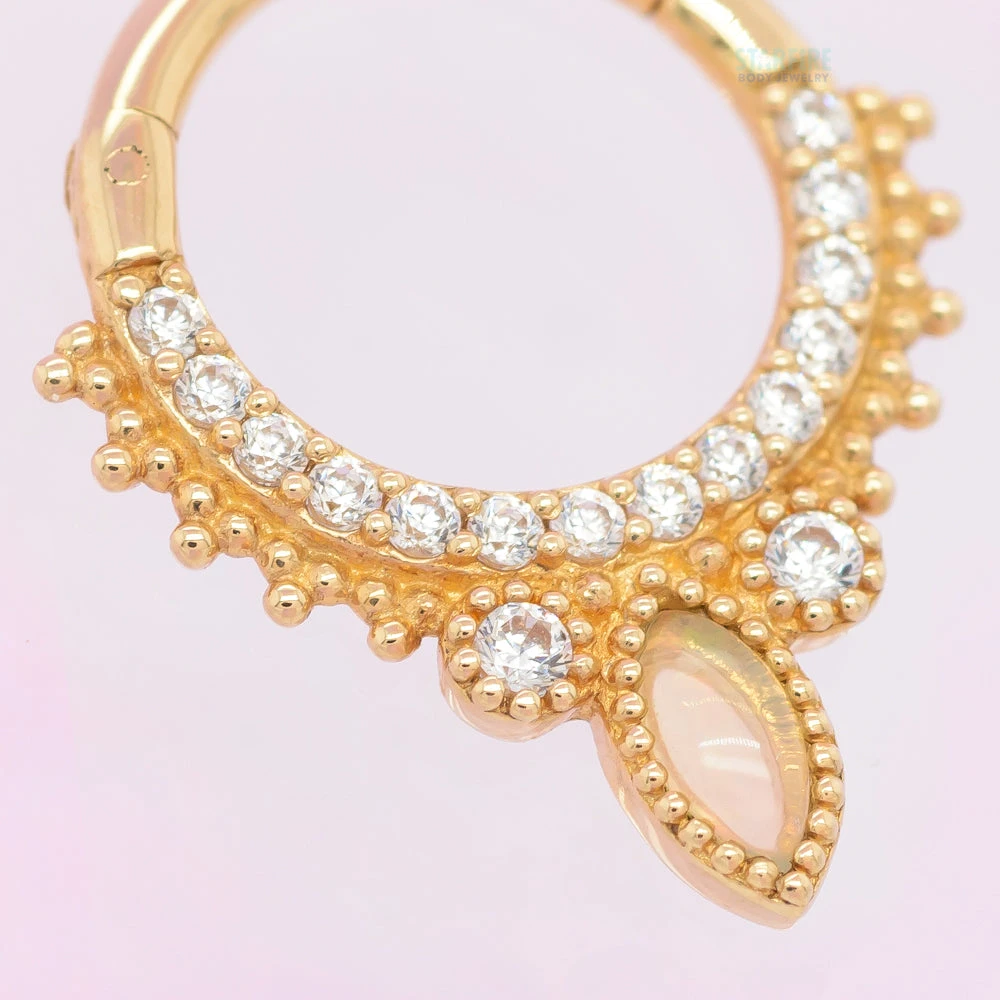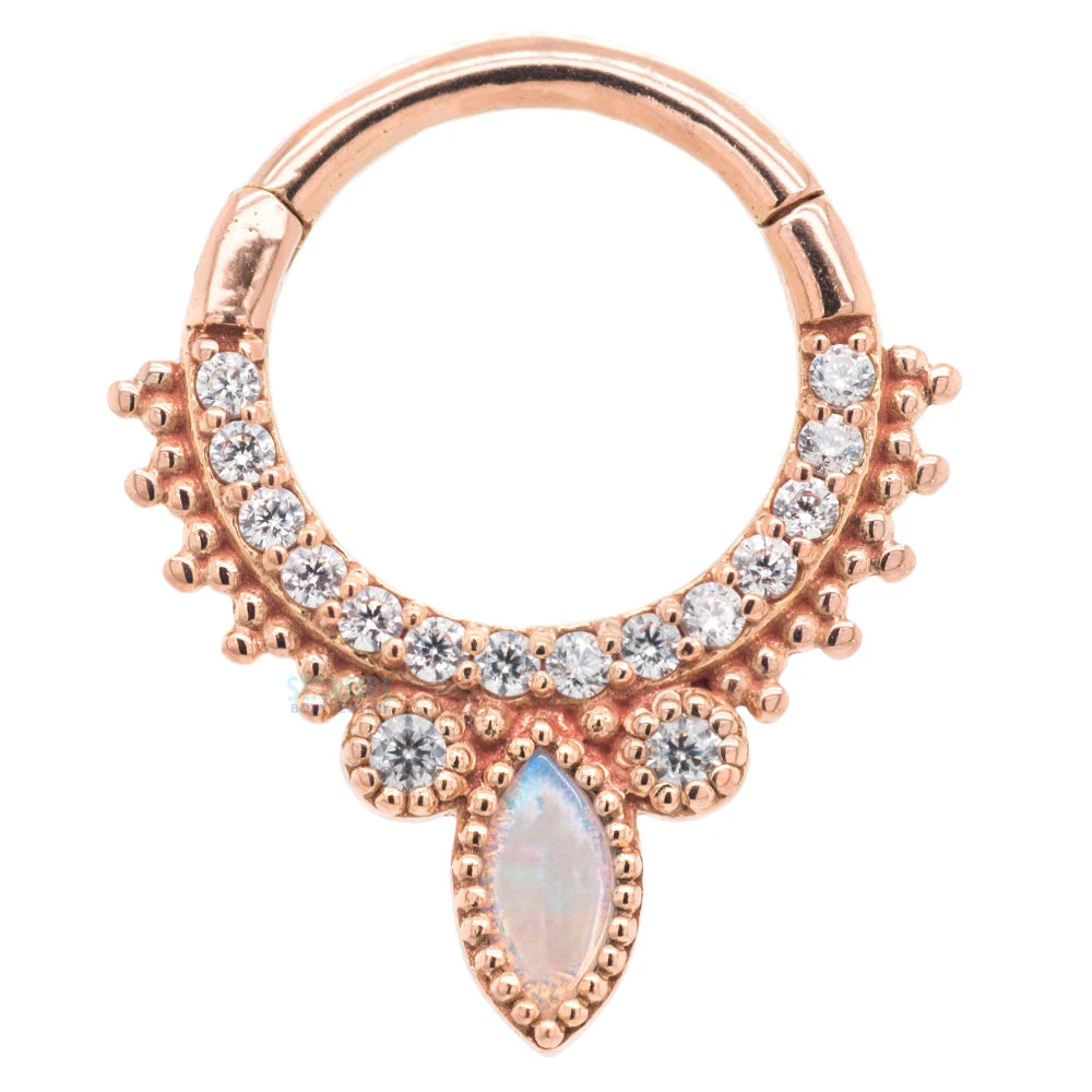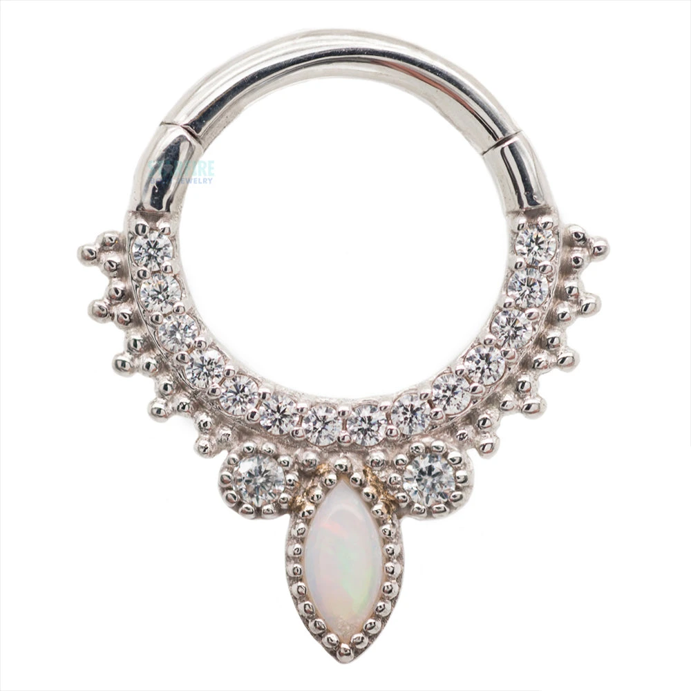 - (1) 4mm x 2mm Marquise-Cut Genuine White Opal in Prong’s surrounded by (2) 1.5mm Round CZ’s in Prong’s & (14) 1mm Round CZ’s in Prong’s