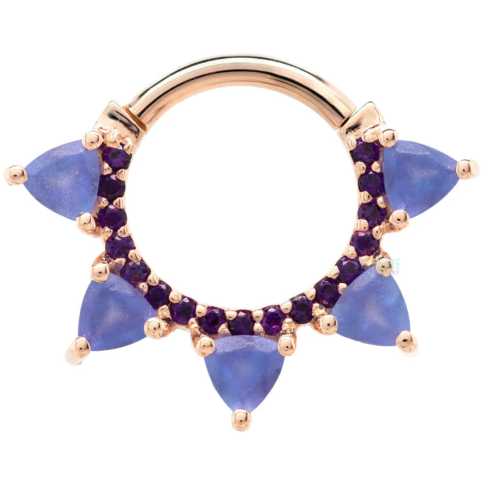Effortlessly elevate your look with this hinge ring featuring a combination of stunning Sandblasted Tanzanite and round Amethyst.