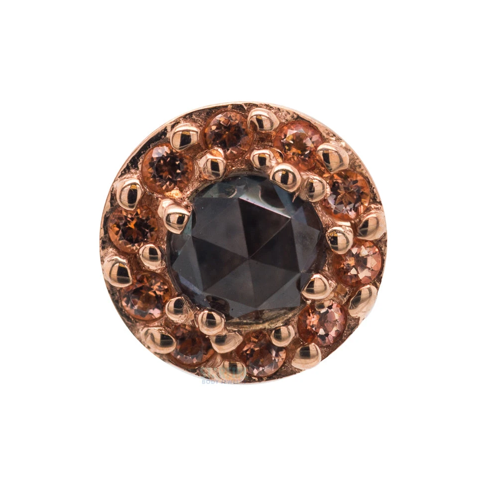- 5.5mm overall with (1) 3mm Rose Cut Grey Sapphire in Prong’s & (10) 1mm Micro Pave Round Genuine Peach Topaz in Prong’s