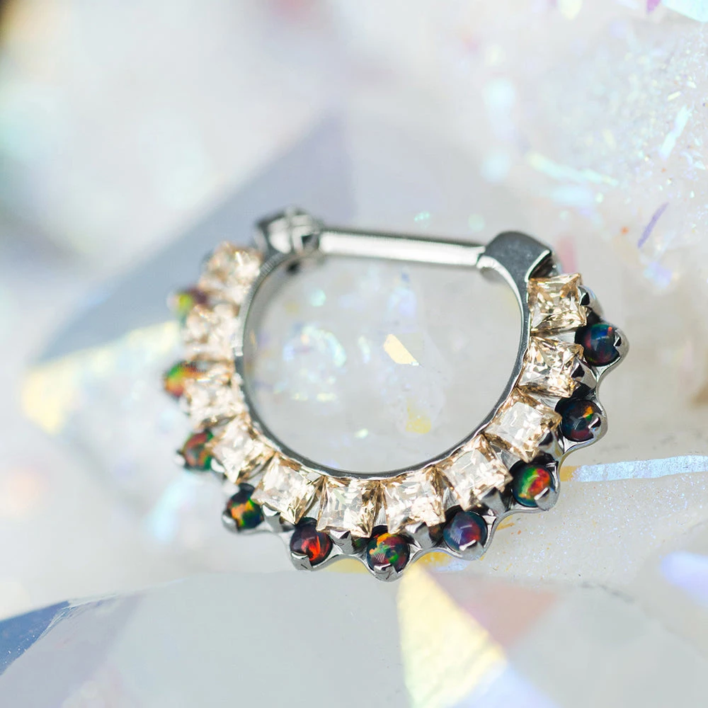 - Material(s): 6AI-7Nb ASTM 1295 implant grade titanium, Swarovski created gemstones, synthetic opal (faux-pal)