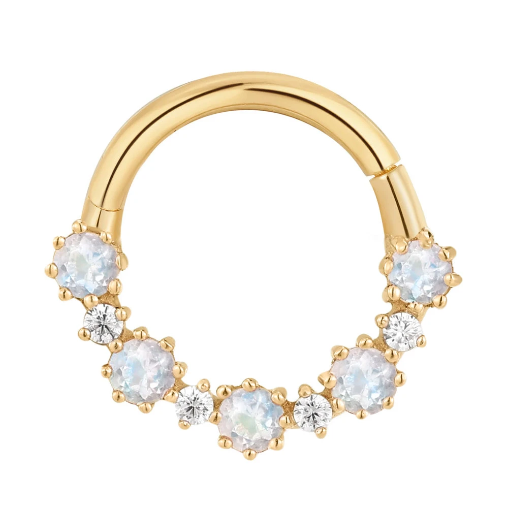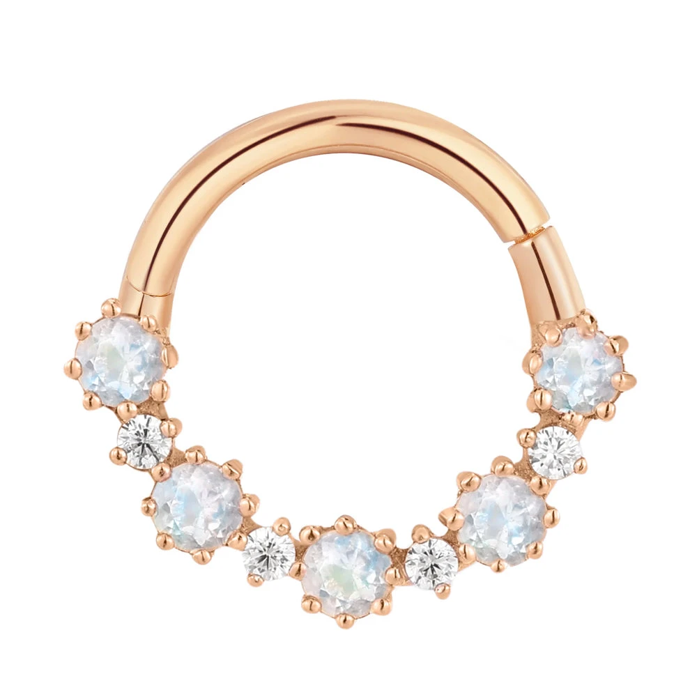 This “Ariana” hinge ring features alternating Rainbow Moonstones and CZ’s that’ll add a stunning iridescence and bling.
