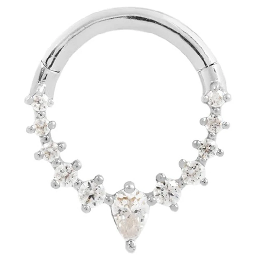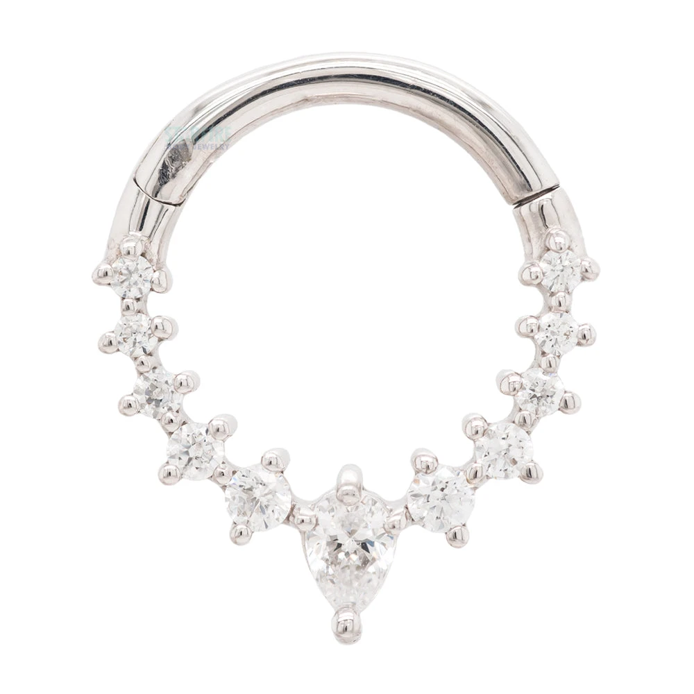 - (1) 2.5mm x 2mm Pear-Cut White CZ surrounded by (2) 1.1mm Round White CZ’s, (2) 1mm Round White CZ’s & (6) 0.8mm Round White CZ’s in Prong’s