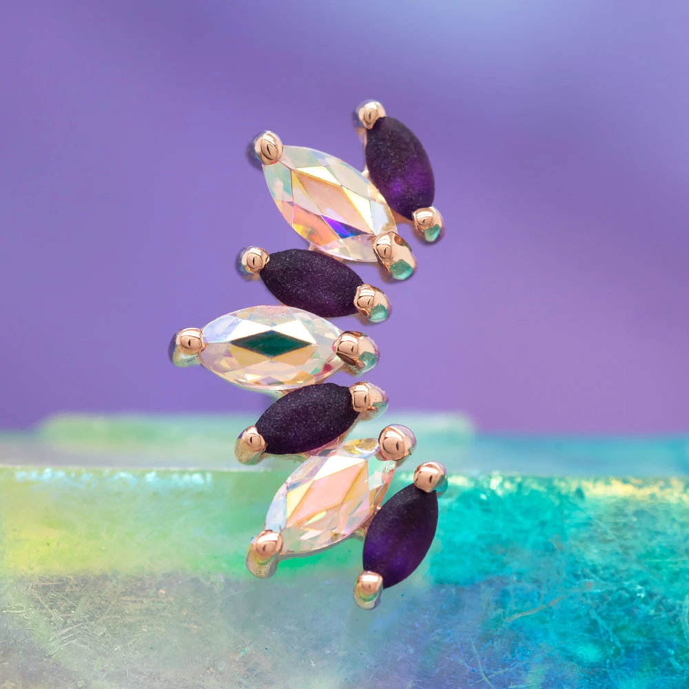 - Tiny: 10mm x 5.3mm threaded end with alternating (4) 2.5mm x 1.25mm Marquise-Cut Genuine Sandblasted Amethyst AA & (3) 3mm x 1.5mm Marquise-Cut Mercury Mist Topaz in Prong’s