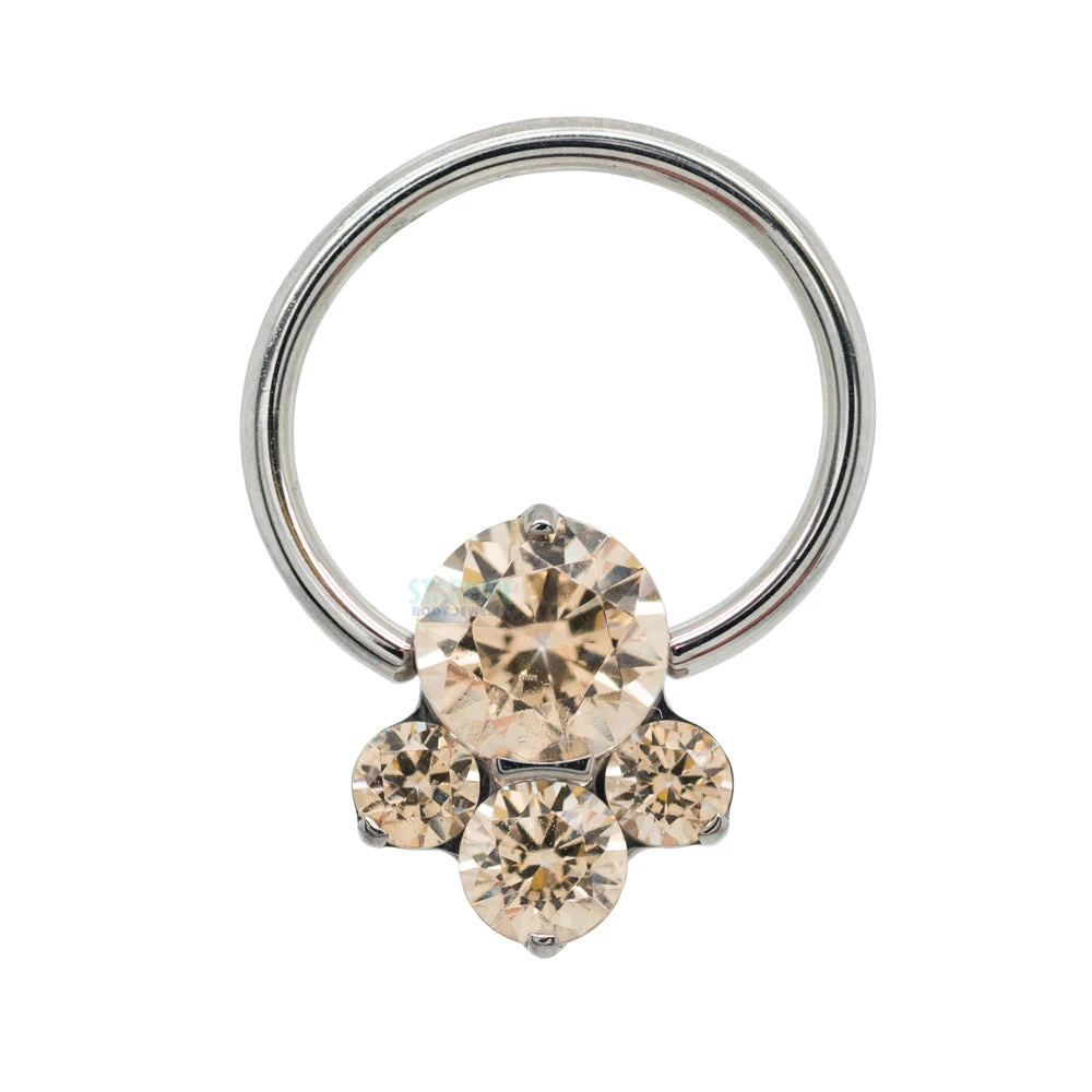 - 3/8″ ring features Caeli #2 (smaller) captive bead: (1) 4mm prong-set faceted stone with 2mm CZ / 2.5mm CZ / 2mm CZ prong set faceted stones below