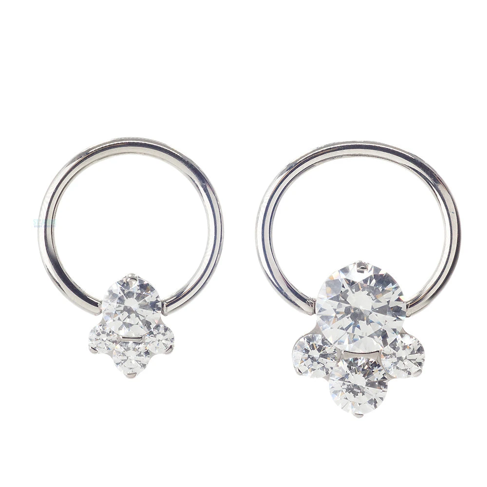 - 7/16″ & 1/2″ rings features Caeli #1 (larger) captive bead: (1) 6mm prong-set faceted stone with 3mm CZ / 4mm CZ / 3mm CZ prong-set faceted stones below