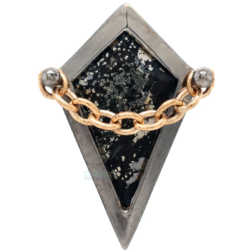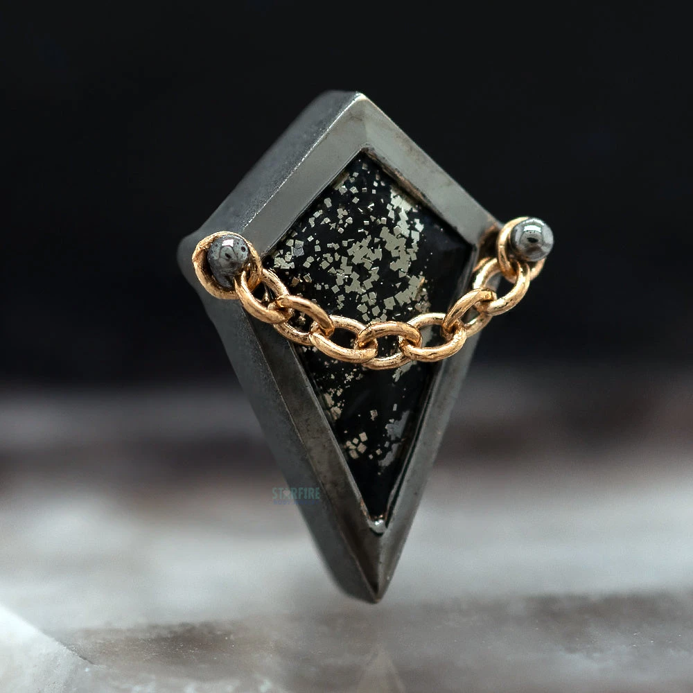 - 10mm x 5mm threaded end with (1) 7mm x 4mm Kite-Cut Pyrite in sandblasted bezel with Yellow Gold chain
