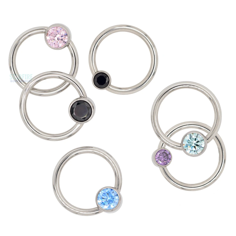 - 3/16″ captive bead with (1) Round Brilliant-Cut Faceted Gemstone in Bezel