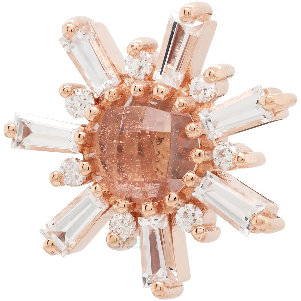 - 10mm threaded end with (7) 2.5mm x 1.3mm x 1mm White Sapphire A Tapered Baguettes & (7) 1mm Round Genuine White Diamonds surrounding (1) 4mm Round Rose Cut Oregon Sunstone in Prong’s
