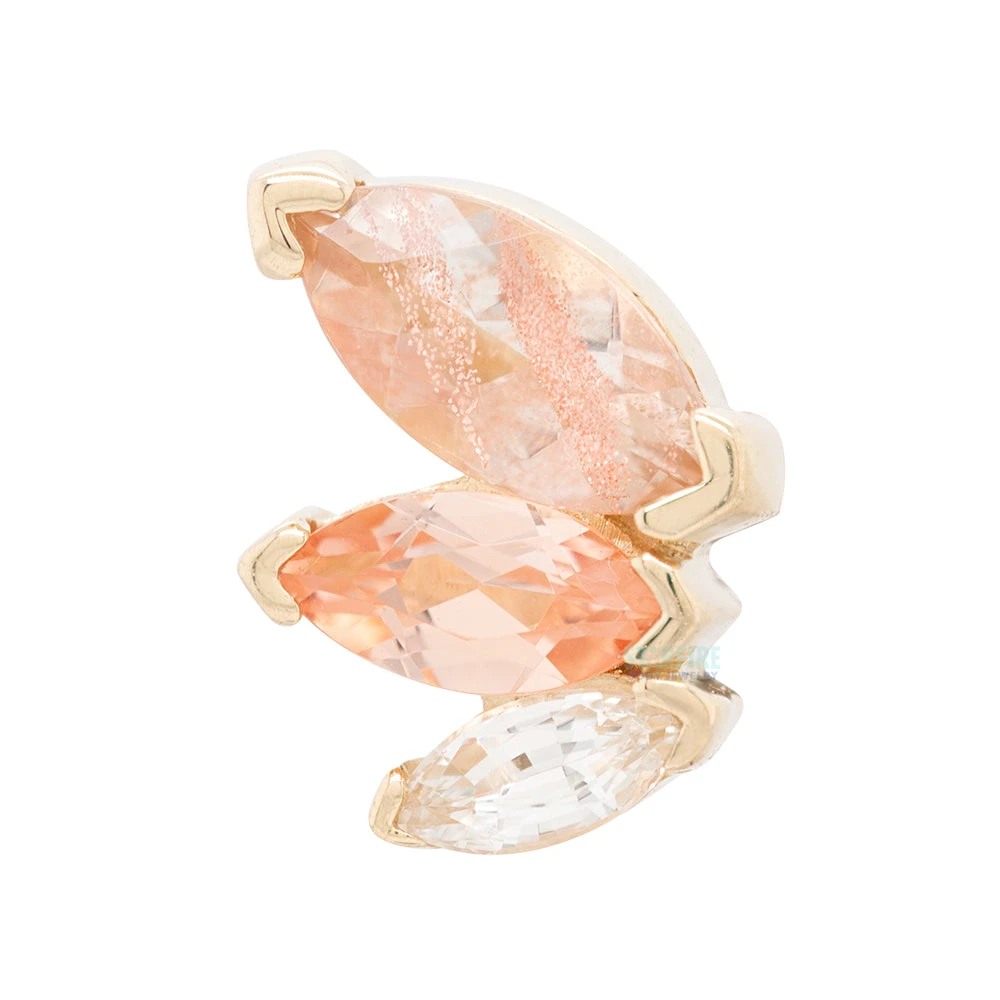 - 7mm x 6mm threaded end with (1) 5mm x 2.5mm Marquise-Cut Oregon Sunstone, (1) 4mm x 2mm Marquise-Cut Champagne Sapphire & (1) 3mm x 1.5mm Marquise-Cut White Sapphire Faceted Gems in Prong’s