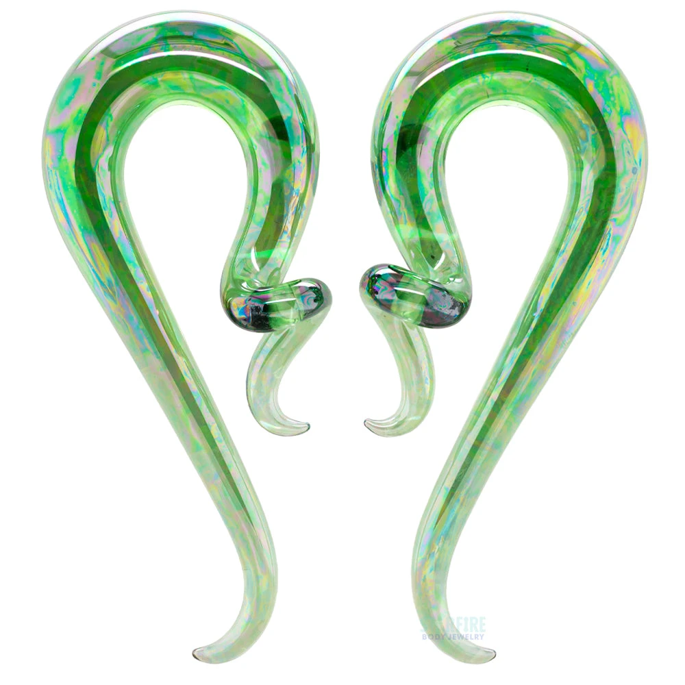 Show off these Glass Coiled Snakes in your stretched lobes. These unique pieces sport a spiral design reminiscent of the reptile they’re named after and are even made of borosilicate glass. Their emerald coloration features an oil slick finish that will produce an iridescent effect with different shades of green and jade.