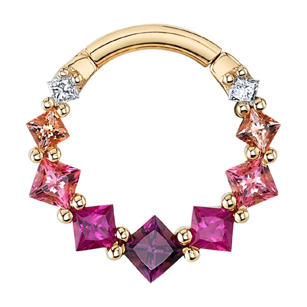 - 3/8″: (1) 3mm Princess-Cut Rhodolite in Prongs surrounded by (2) 2.5mm Princess-Cut Hot Pink Sapphires, (2) 2.5mm Princess-Cut Pink Topaz’, (2) 2mm Princess-Cut Peach Topaz’ & (2) 1.5mm Princess-Cut Genuine White Diamonds in Prongs