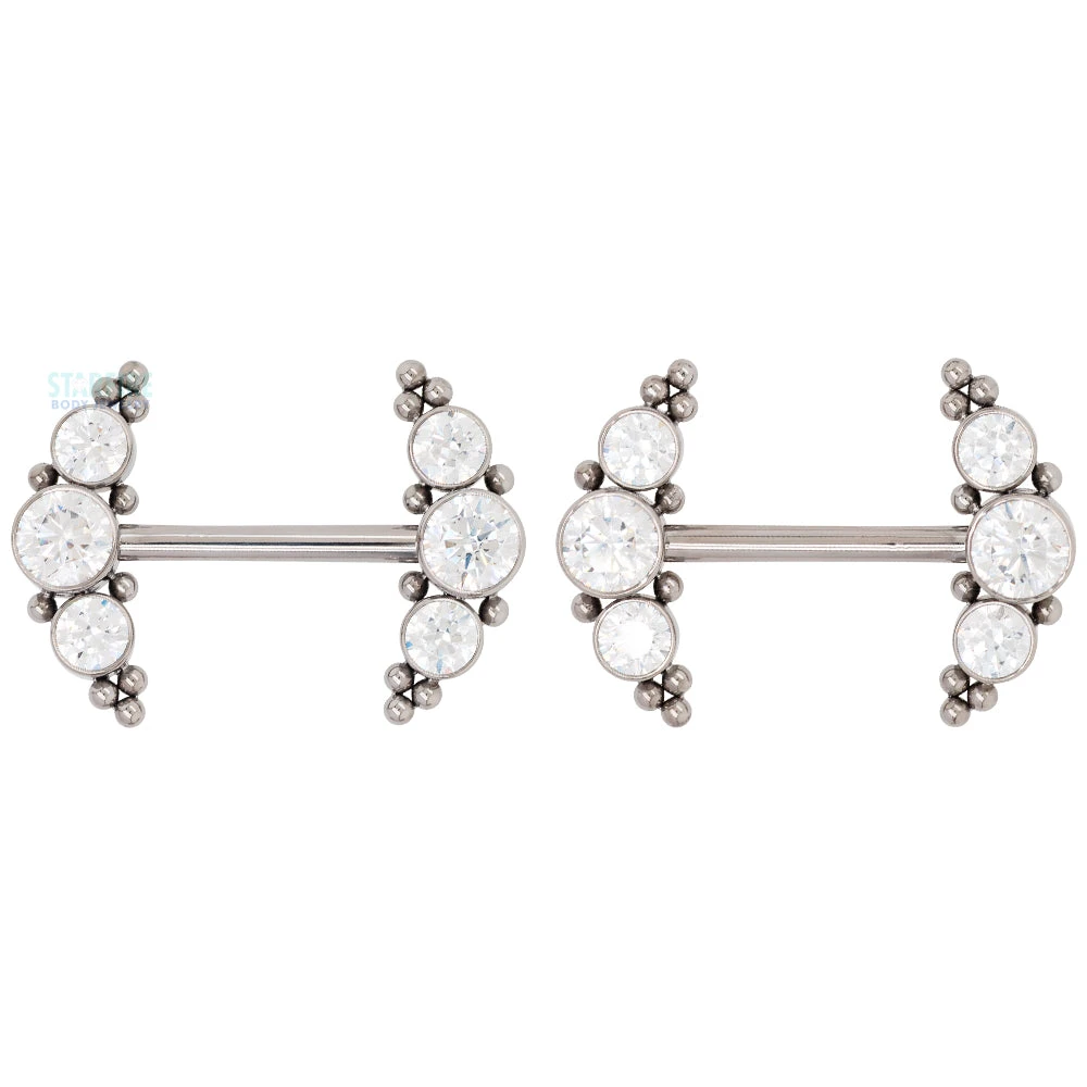 Add a touch of glamour to your jewelry collection with these nipple barbells featuring a glimmering curved cluster.