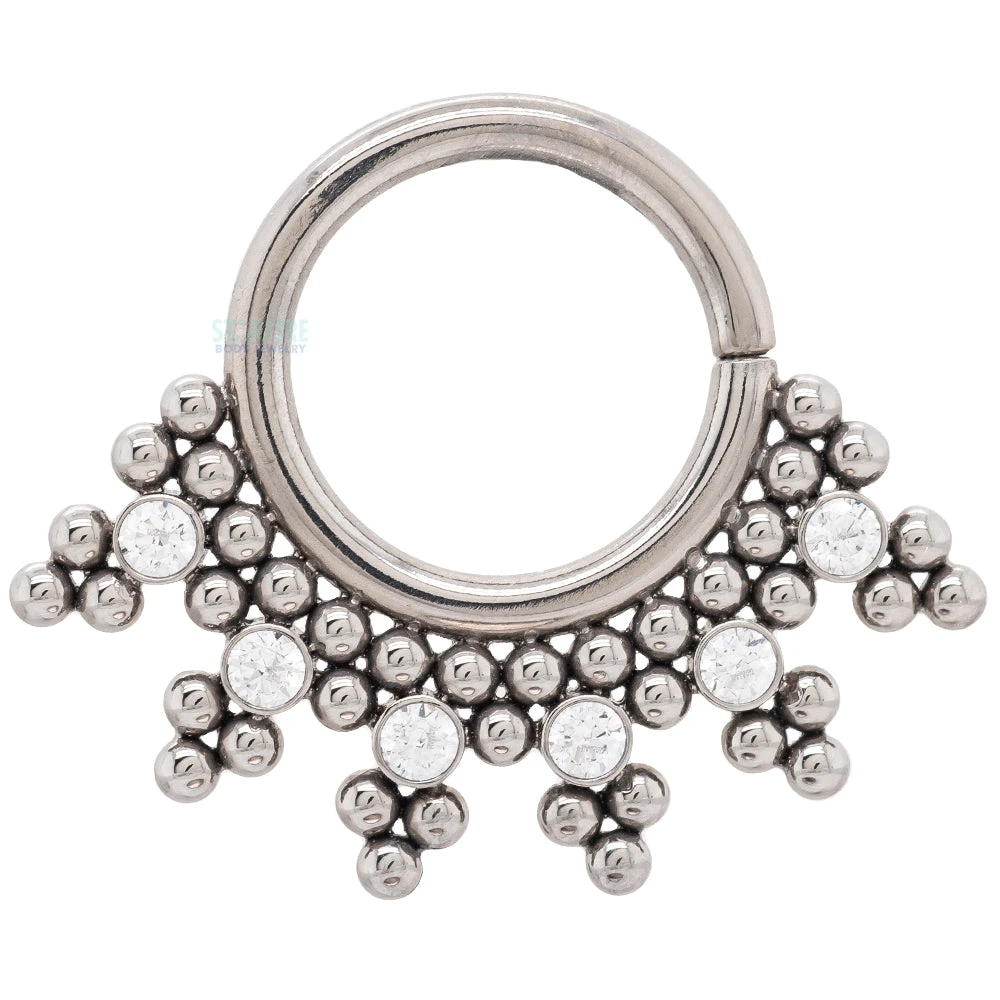 Bead lovers look no further! This piece features a row of beads on the bottom side of the ring and faceted gems underneath, with tiny tri bead accents on the bottom of each bezel.