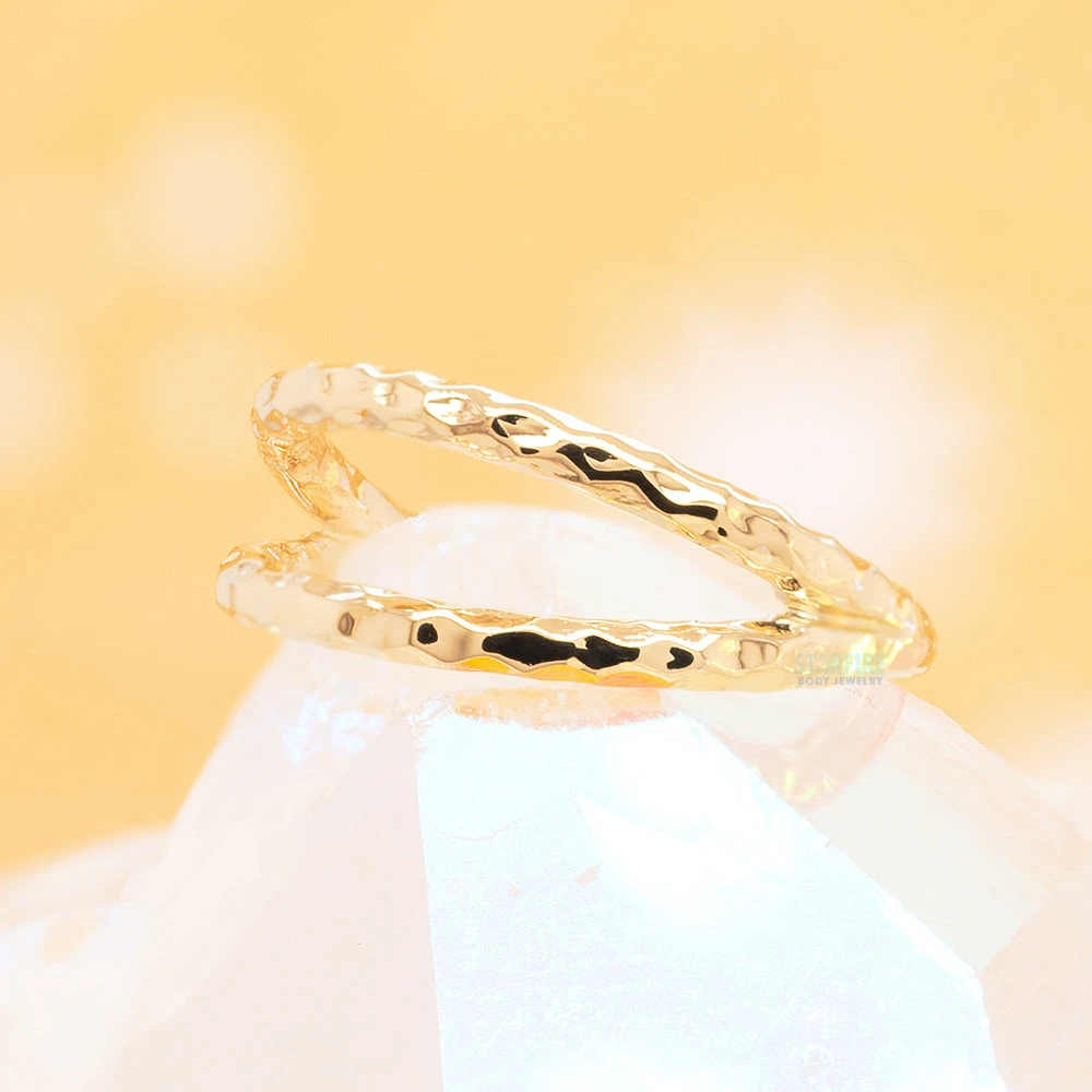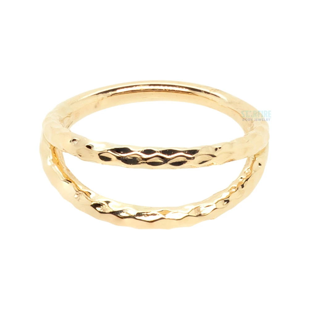 With this Illusion Hammered Finish Ring in Gold, you can now have two rings in one piercing! Show off your cool style and flaunt the unique look that only this double ring can achieve.