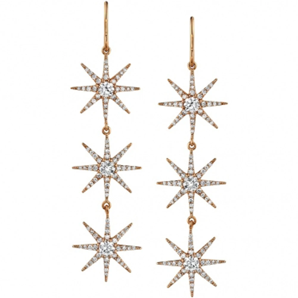 These “Kerry Star” earrings make the perfect piece to add glam. Full of style and elegance, this pair of earrings feature three eight pointed stars that dangle down like a chandelier. Each starburst holds a single genuine white diamond center that is surrounded by even more diamond accents!