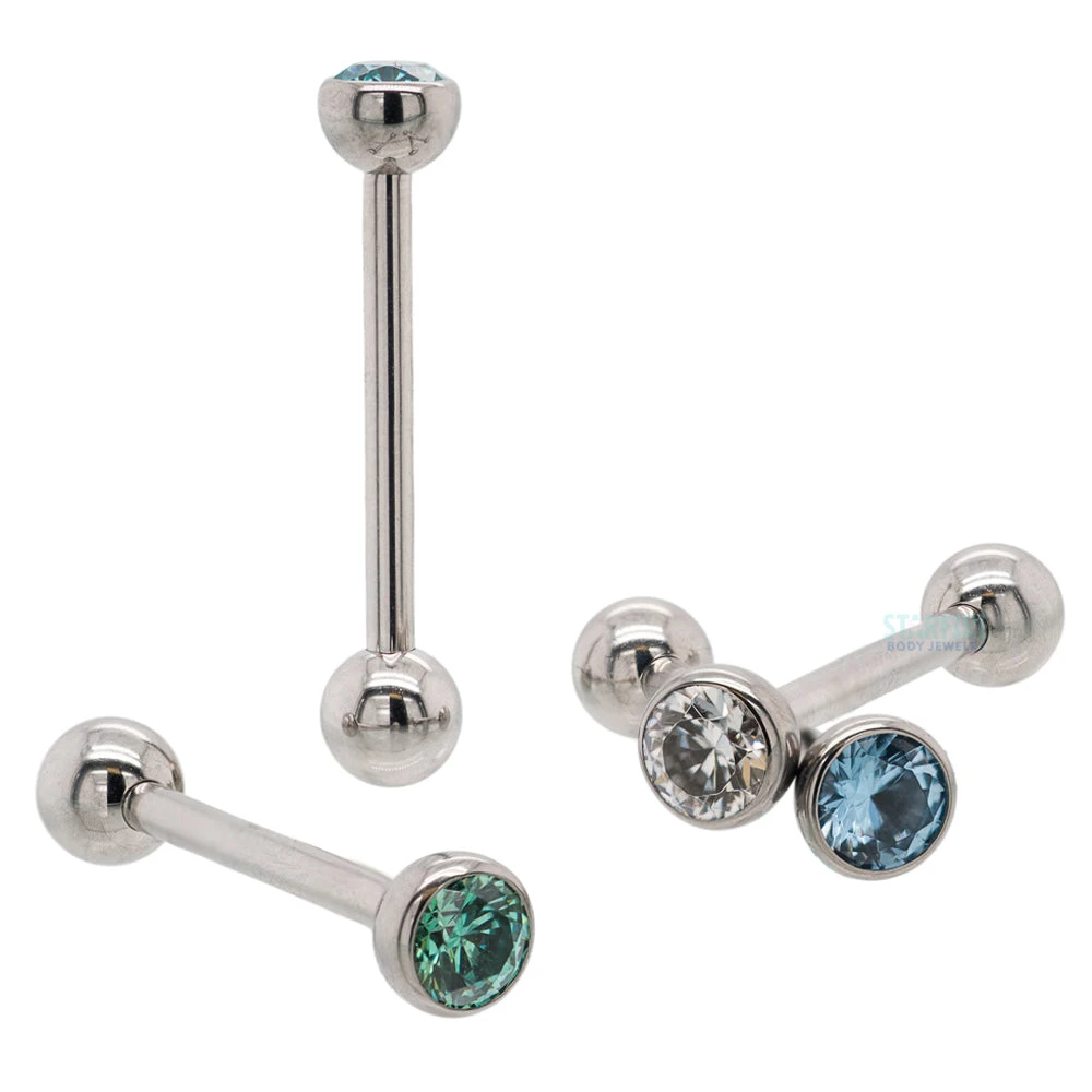Our top selling CZ tongue barbell in studio. Featuring a low profile bezel setting that showcases more of the faceted gem while keeping the smooth comfort of the ball on the base.