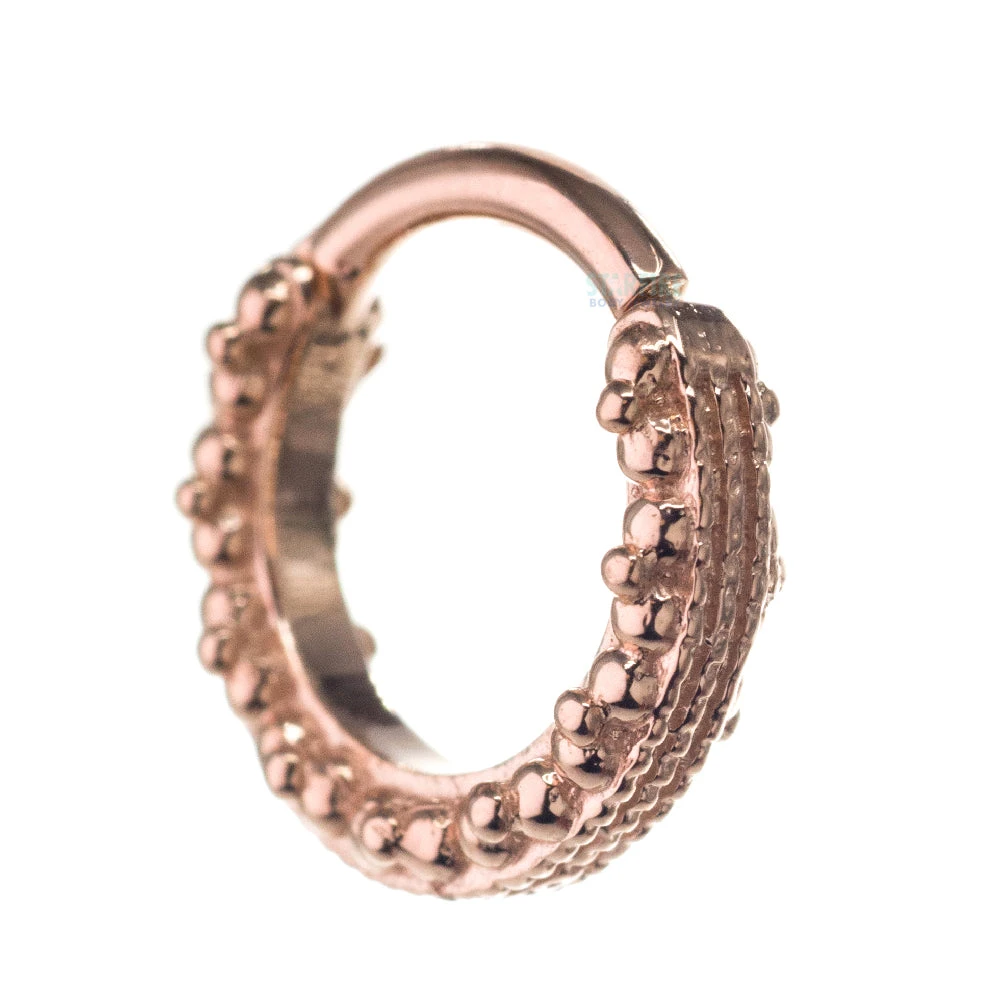 Details from every angle! The “Luna” hinge ring has an outward facing Millgrain strip center with tiny tri bead accents on each side.