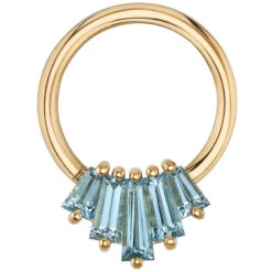 - 8.5mm x 6mm fixed cluster with (1) 5mm x 2mm x 1.5mm Tapered Baguette-Cut Aquamarine surrounded by (2) 4mm x 2mm x 1.5mm & (2) 3mm x 2mm x 1.5mm Baguette-Cut Aquamarine in Prong’s