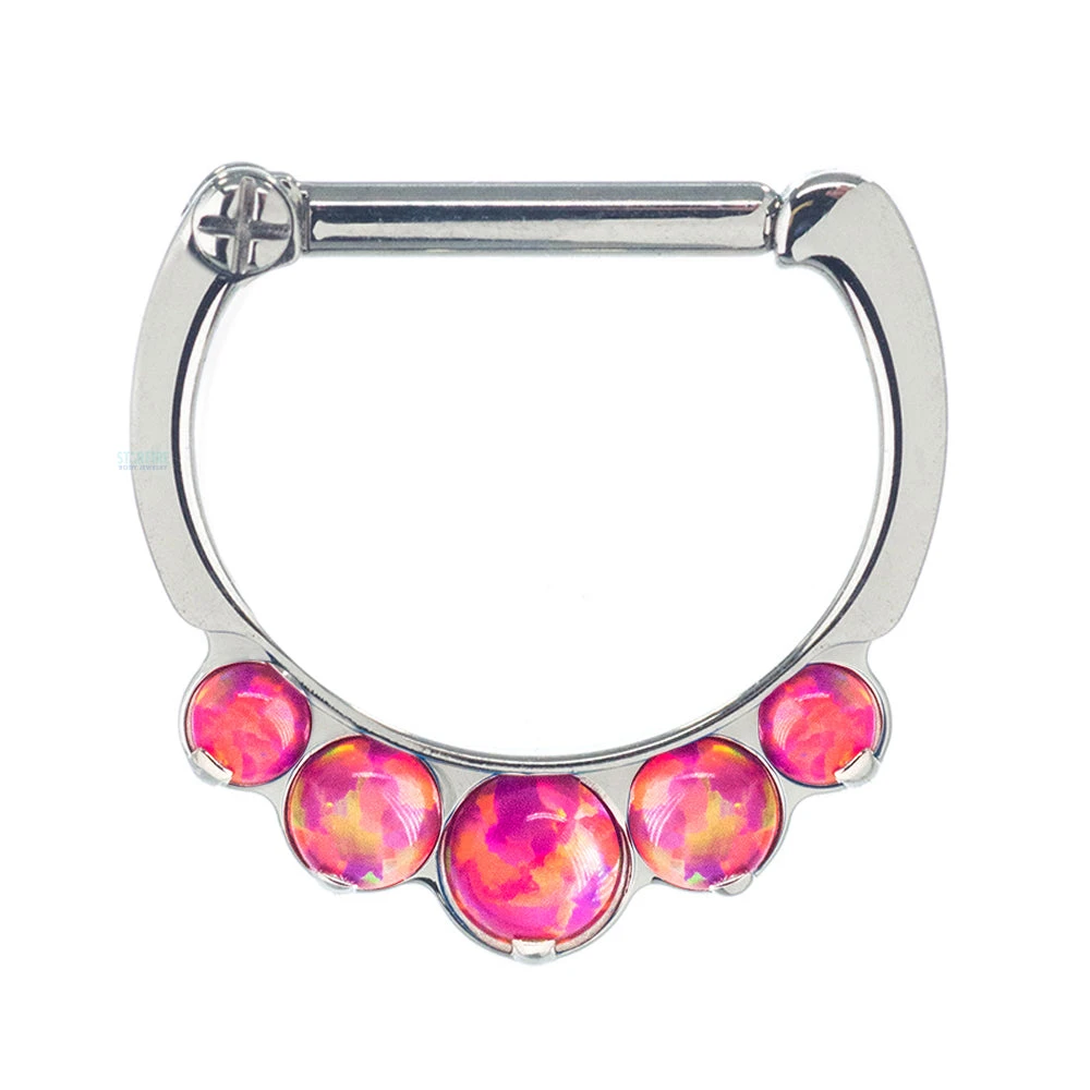 A classic staple often adorned in a Septum or Daith piercing. A part of the Odyssey Collection. Prong-set synthetic opal cabochons with light reflecting fire. Featuring a longer post length if standard doesn’t cut it.