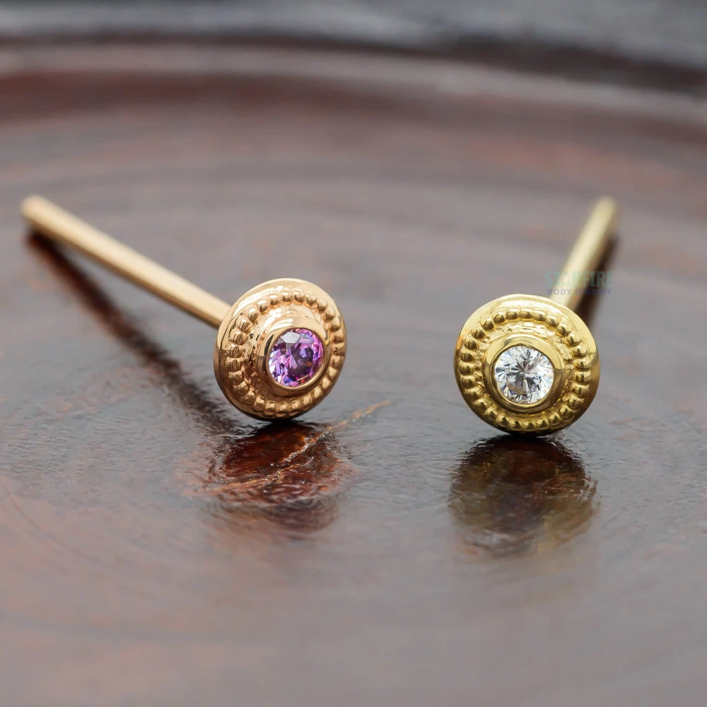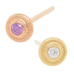 - 5mm end with (1) 2mm Brilliant-Cut Round Faceted Gemstone in Bezel