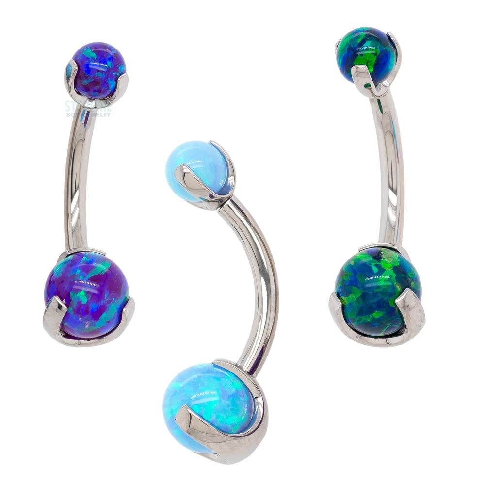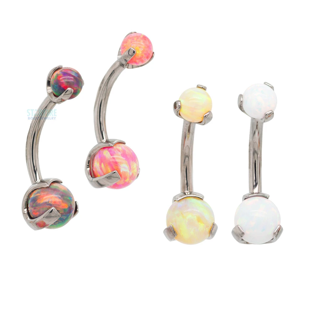 Our top selling opal navel curve in studio. Claw-set so you can see as much of those opals as possible.