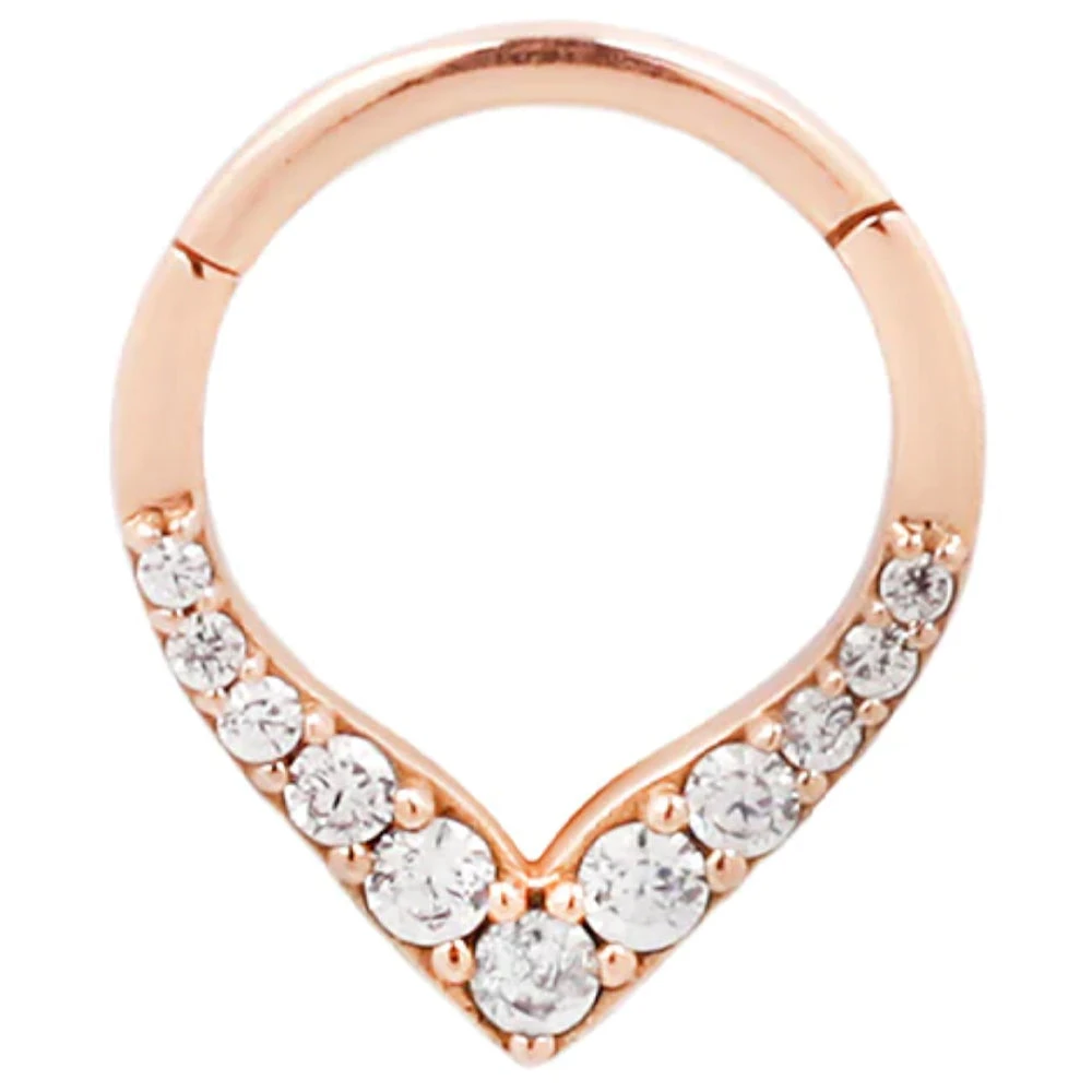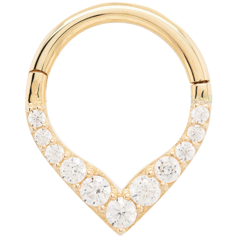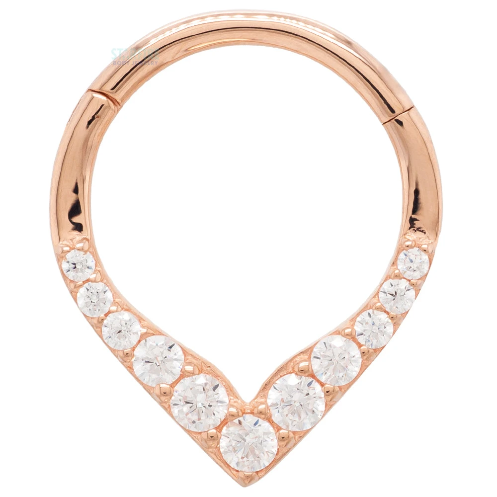 The “Rise & Shine” hinged ring has progressively larger gems descending down to an elegant point.