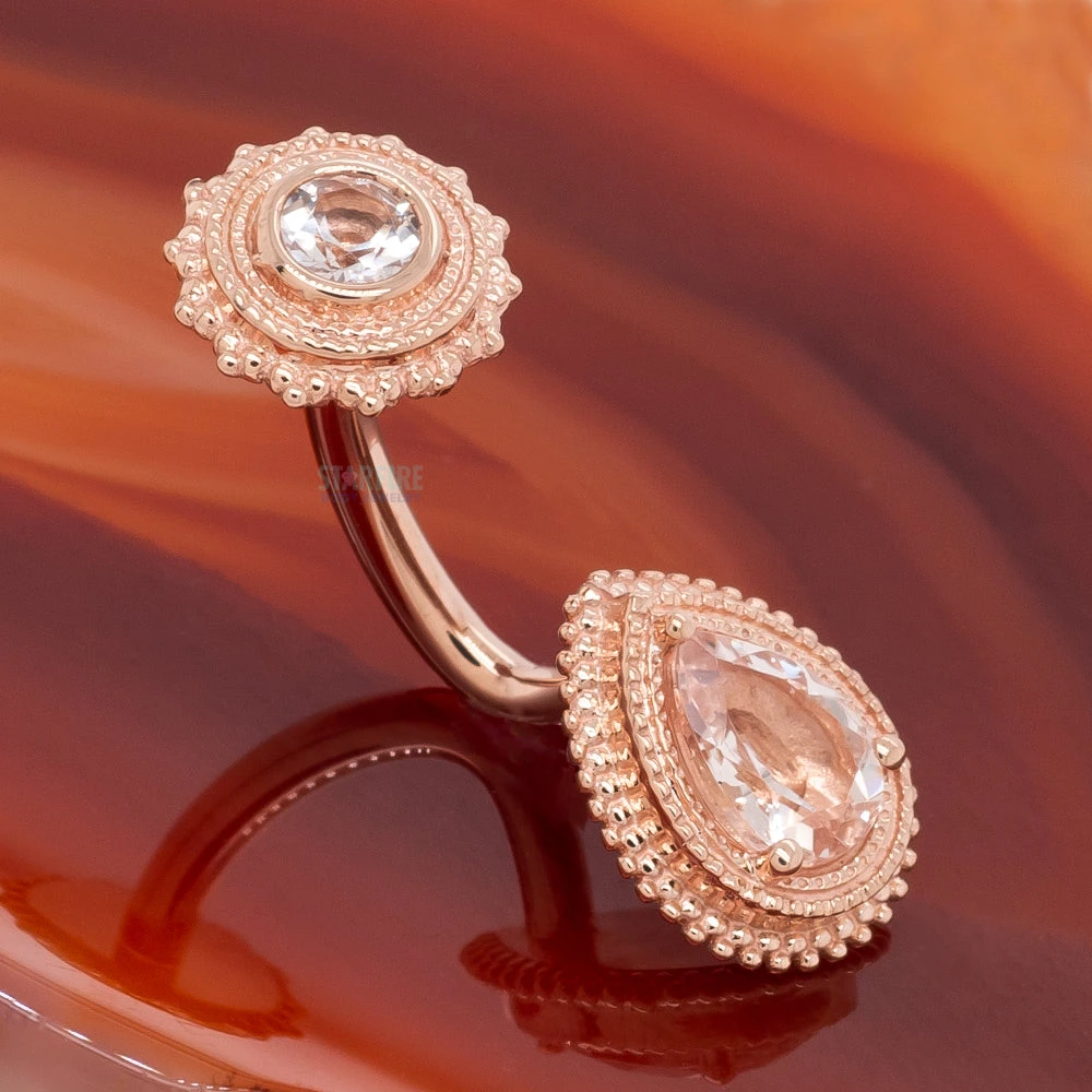 This Robyn Afghan Navel J Curve is everything beautiful and stylish. It features a fixed bottom holding a (1) 6mm x 4mm Pear Cut Morganite and (1) 3mm Round Morganite encased in a bezel cup setting surrounded by intricate detailing.