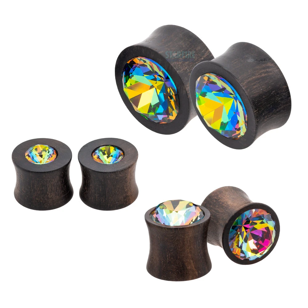 A stained glass inspired stone with greens, reds and oranges in a dark ebony wood. The contrast is everything!