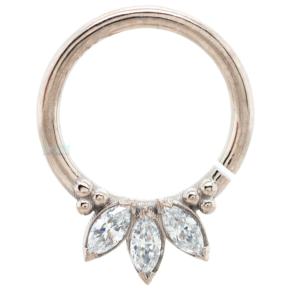 Whether curating your daith or septum, the “Sedona 1” makes a wonderful choice for adding a hint of glam. This piece features a cluster of marquise-cut gemstones that are accented by tiny tri-beads.