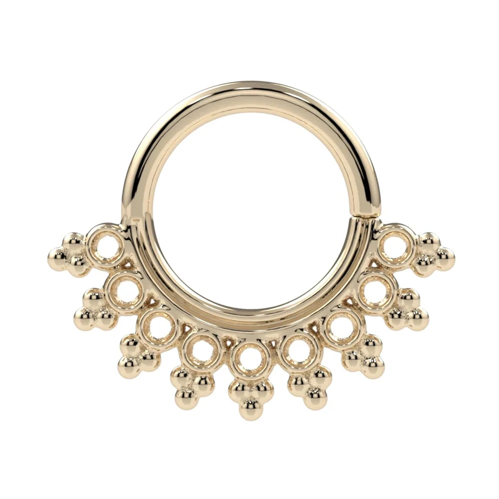 Introducing the latest addition to the Shiva Arc collection, this seam ring displays a row of circle cutouts accented by tiny tri-bead clusters, paying tribute to a Hindu deity.