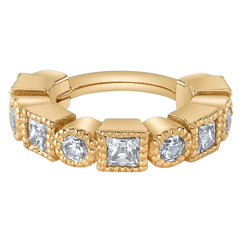 With a mix of princess cut and round Diamonds, this hinge ring is sure to catch everyone’s eyes.