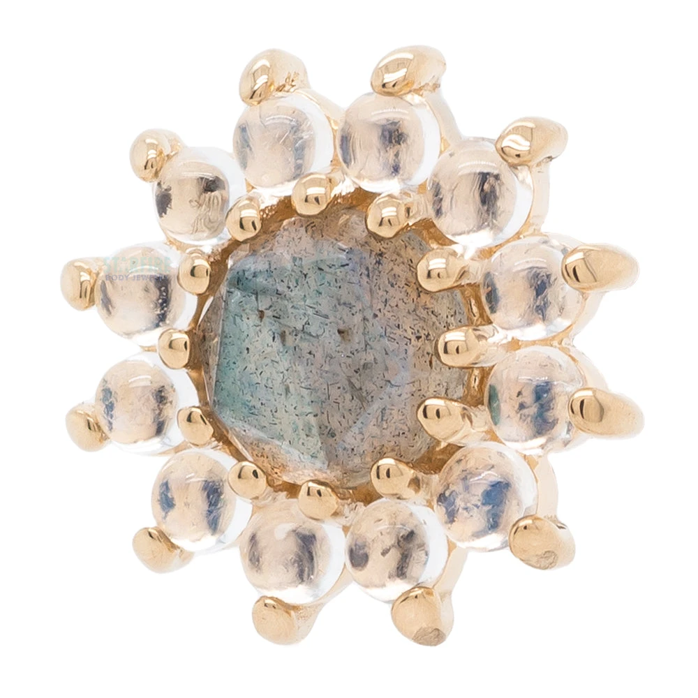 - 10mm threaded end with (1) 5mm Rose Cut Labradorite Cabochon in Prong’s surrounded by (12) 1.75mm Round Rainbow Moonstone in Prong’s