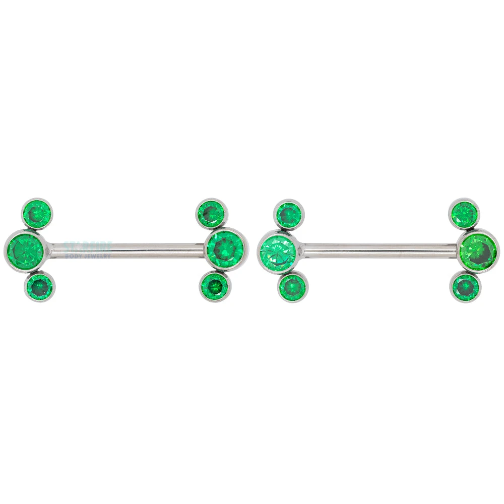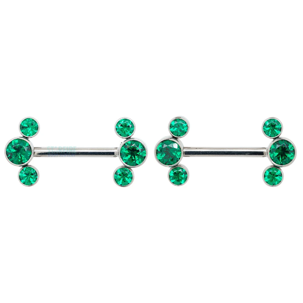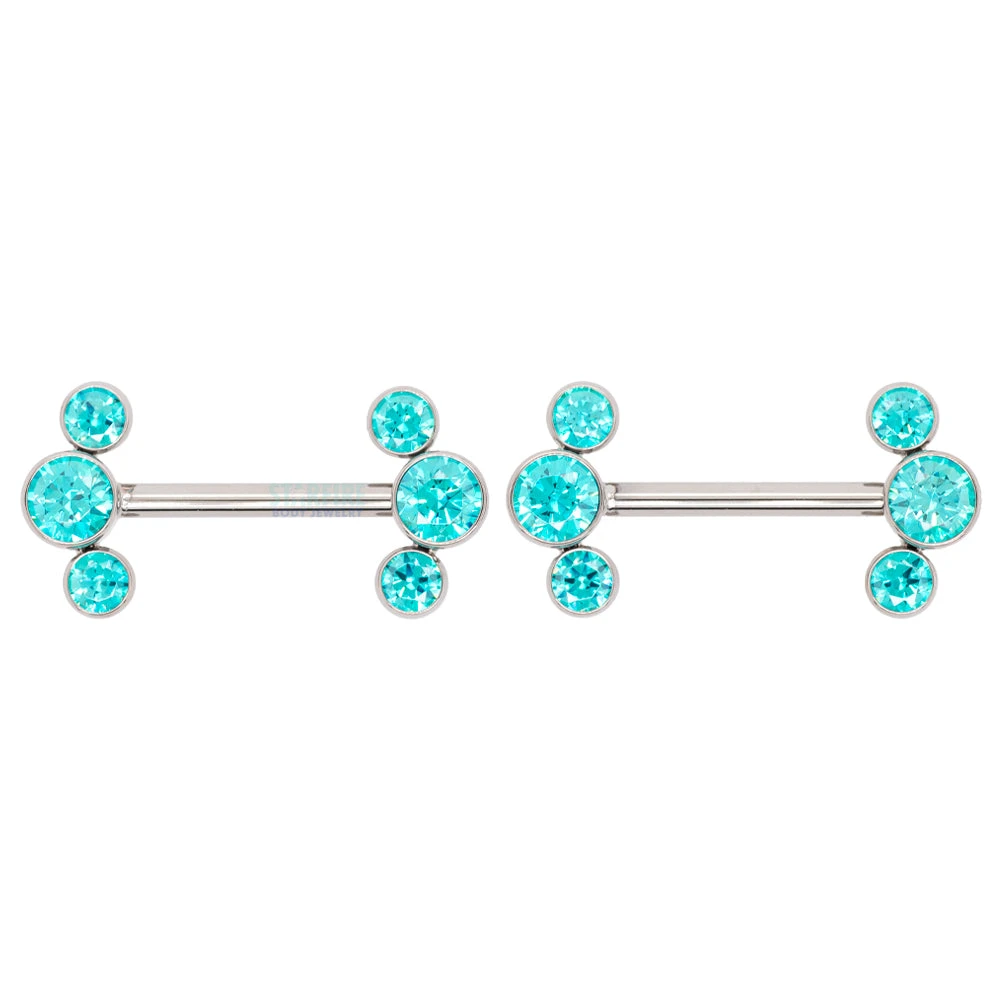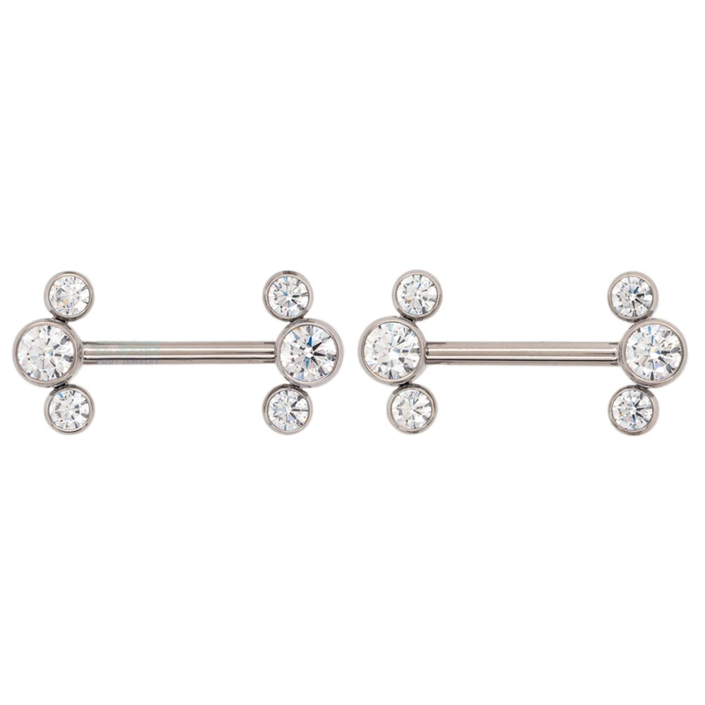 - 11mm fixed end with (1) 4mm Round Brilliant-Cut Faceted Gemstone surrounded by (2) 3mm Round Brilliant-Cut Faceted Gemstones with a matching threadless end in Bezels