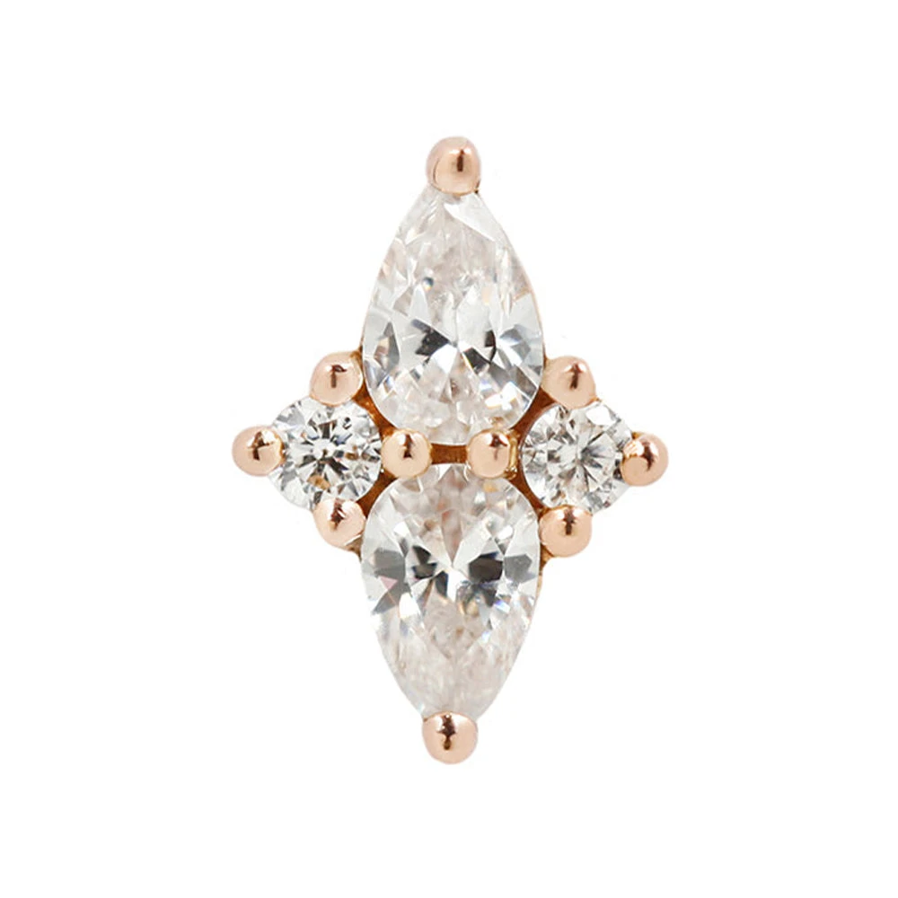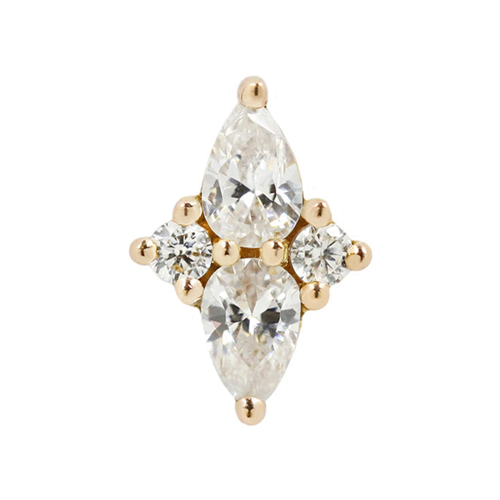 - 7mm x 5mm threadless end with (2) 2mm x 3mm Pear-Cut White CZ’s & (2) 1.3mm Round White CZ’s in Prong’s