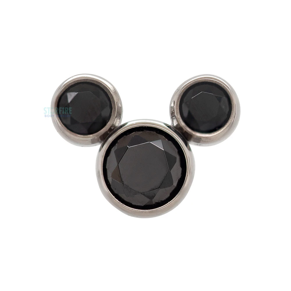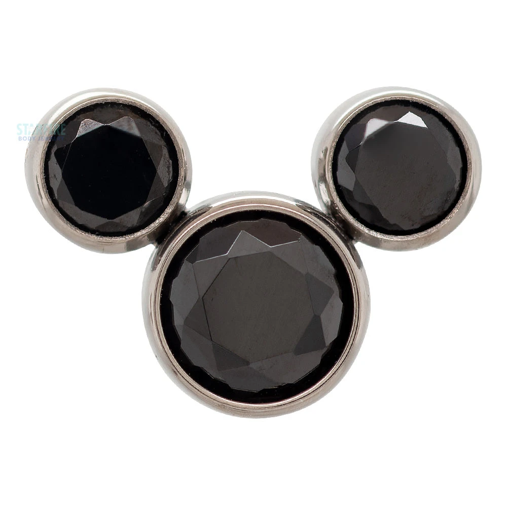 - 6.5mm x 5mm threadless end with (1) 3mm Brilliant-Cut Round Faceted Gemstone in Bezel & (2) 2mm Brilliant-Cut Round Faceted Gemstones Ears in Bezels