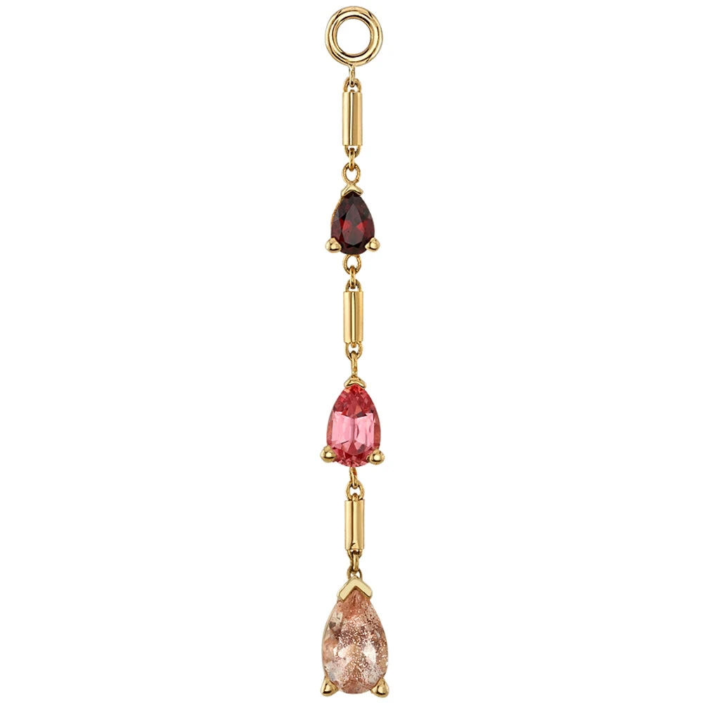 - 1 1/16″ total length with (1) 3mm x 2mm Pear-cut Garnet, (1) 4mm x 2.5mm Pear-cut Padparadscha Sapphire & (1) 5mm x 3mm Pear-Cut Oregon Sunstone in Prong’s on Ophelia Chain